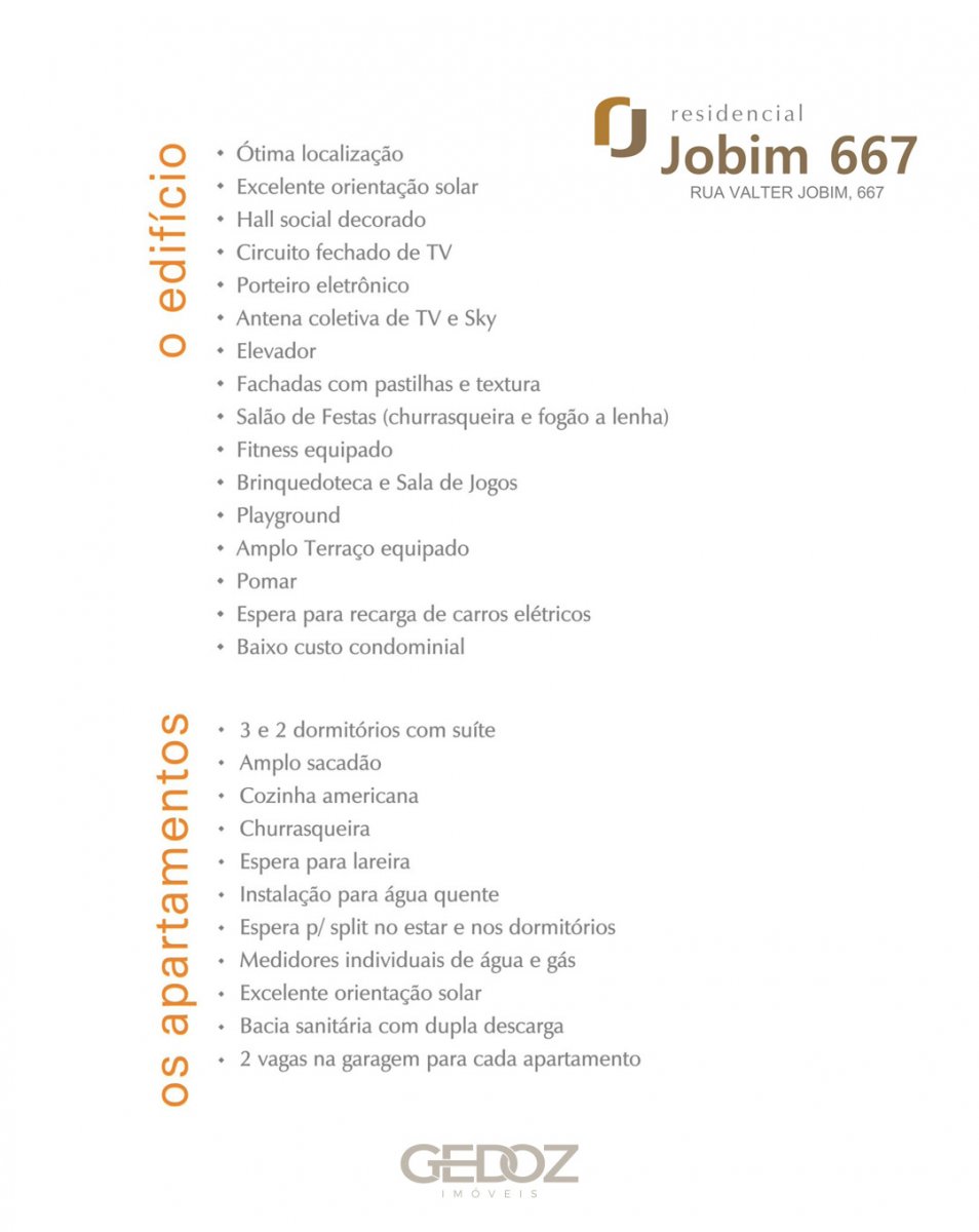 Jobim 667 traz uma infraestrutura completa para você viver uma vida sossegada em Carlos Barbosa. A união da residência, do lazer e da convivência: o equilíbrio perfeito que garante praticidade no seu jeito de morar. . 2 e 3 dormitórios com suíte Amplo terraço com pomar Playground Fitness equipado Brinquedoteca Sala de jogos Salão de festas . Rua Valter Jobim, 667 Carlos Barbosa - RS . Entre em contato através do WhatsApp 📱54 99204.1117
