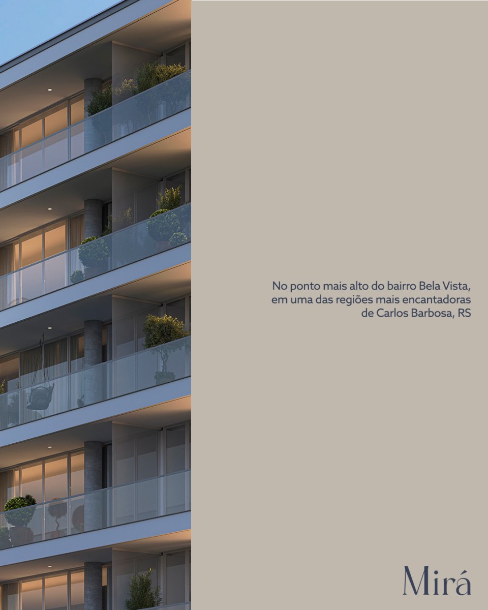 E se, ao chegar em casa, o tempo pausasse? Mirá é um convite ao essencial. Onde o conforto e uma vista deslumbrante se encontram. São apenas 10 unidades de 185m², até 4 vagas de garagem, spa, salão de festas, espaço gourmet externo e guarita de segurança. No topo do Bairro Bela Vista, o tempo desacelera com elegância e encontra o seu ritmo. Entre em contato e descubra mais sobre esse lançamento exclusivo em Carlos Barbosa – RS. Incorporação: R.2/29.660